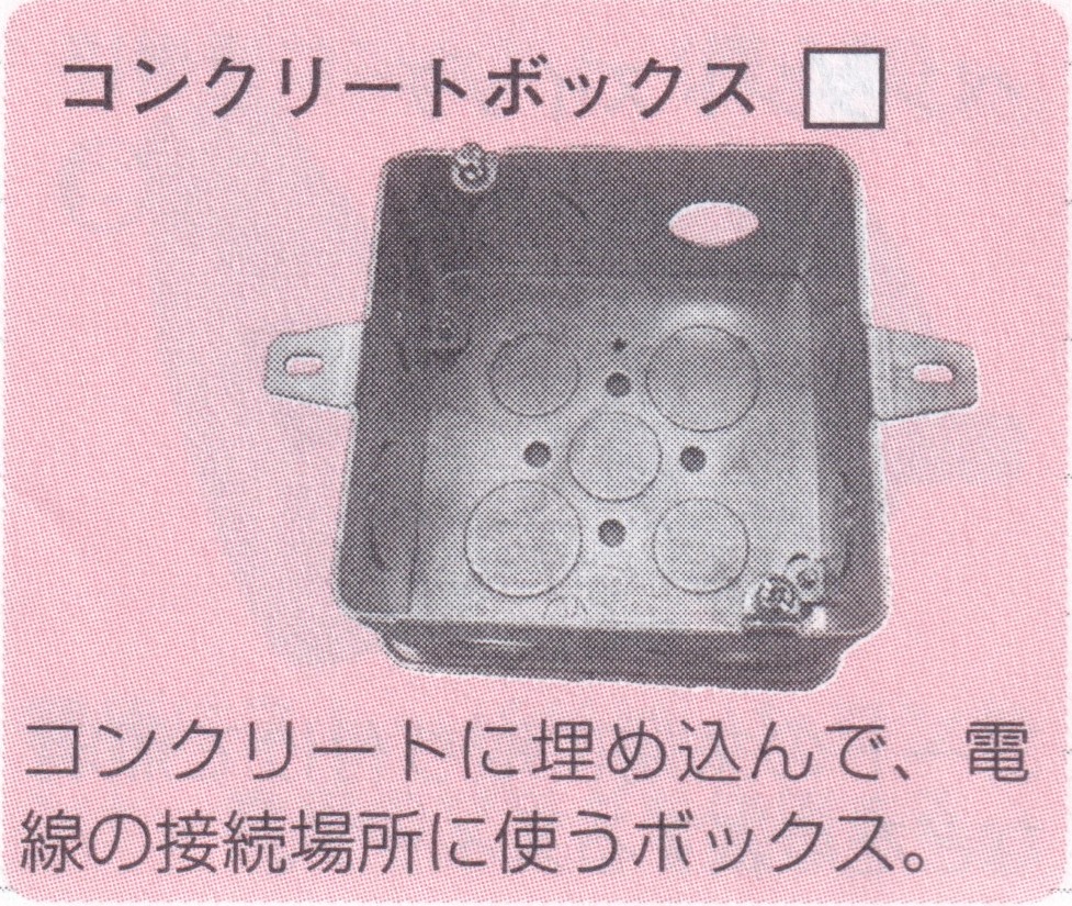コンクリートに埋め込みんで、電線の接続場所に使うボックス。